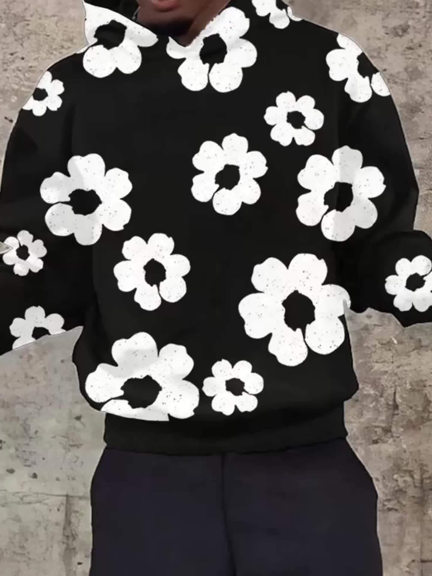 Men'S Casual Black Hoodie with White Floral Print - Trendy Long Sleeve Pullover, Regular Fit, Slight Stretch Fabric, Casual Wear Hoodie|Floral Print Hoodie|Stretchy Fabric Hoodie, Hoodie, Sweatshirt, Sweatshirt Set, Sweatshirt Set for