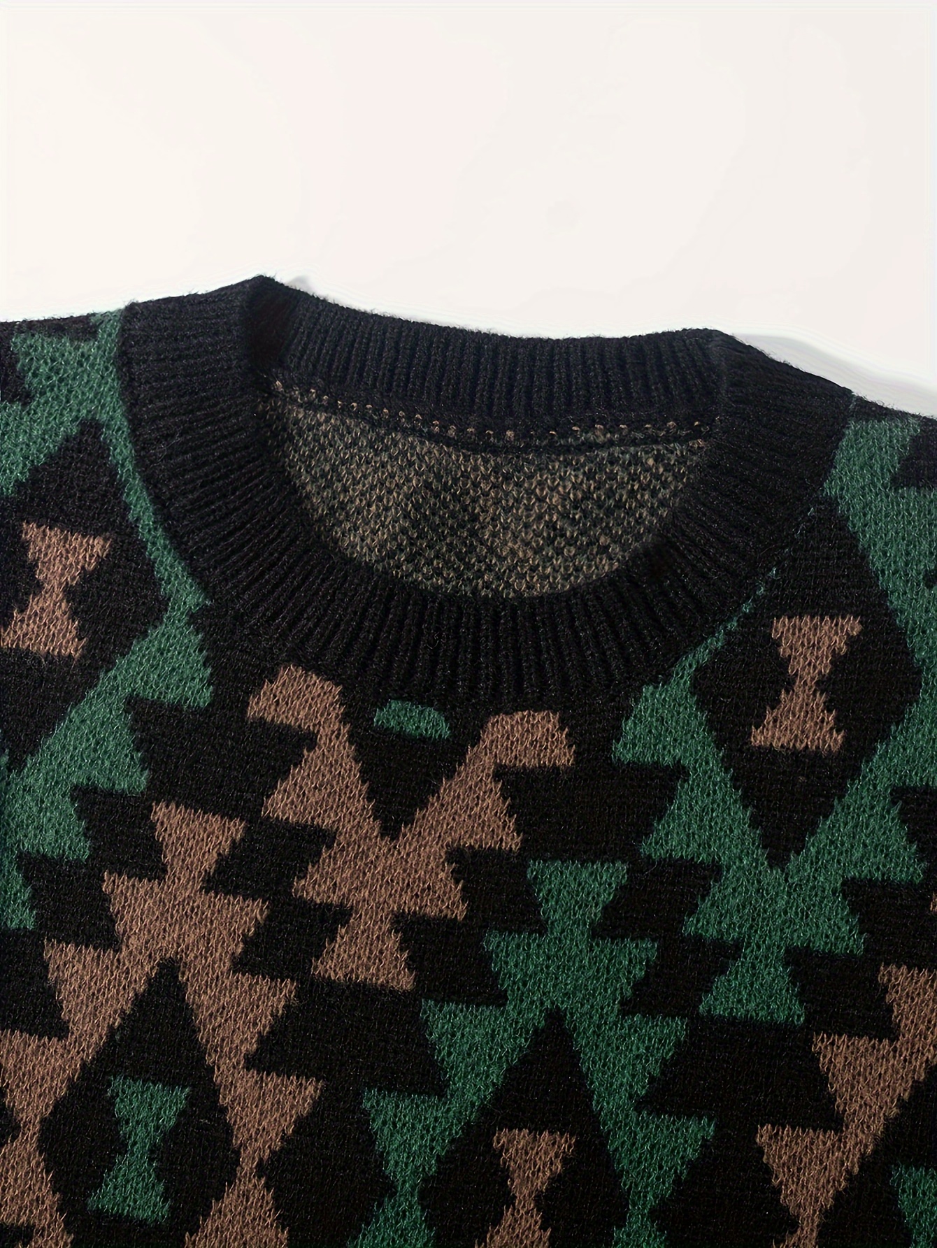 Men's Casual Geometric Pattern Knit Sweater - Asymmetrical Design, Machine Washable, Round Neck, Regular Fit for Autumn/Winter, Brown/Red/Black/White/Gray, Knit Sweater, Winter Warm Top, Autumn Fashion, Relaxed Fashion, Comfortable Wear, Durable Fabric