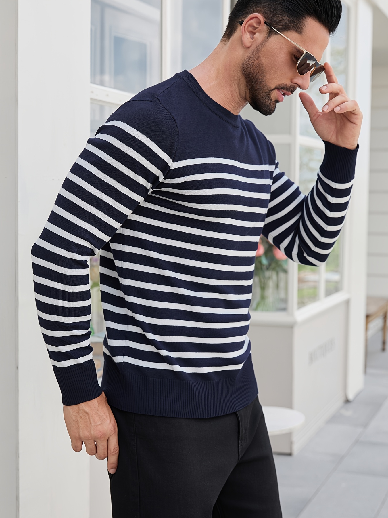 Men'S Casual Striped Knit Sweater - Navy & Vertical Stripes, Long Sleeve Crew Neck, Medium Stretch, Regular Fit for Spring/Fall, Versatile Layering Piece, Spring Fall Apparel | Classic Striped Design | Medium Stretch Fabric