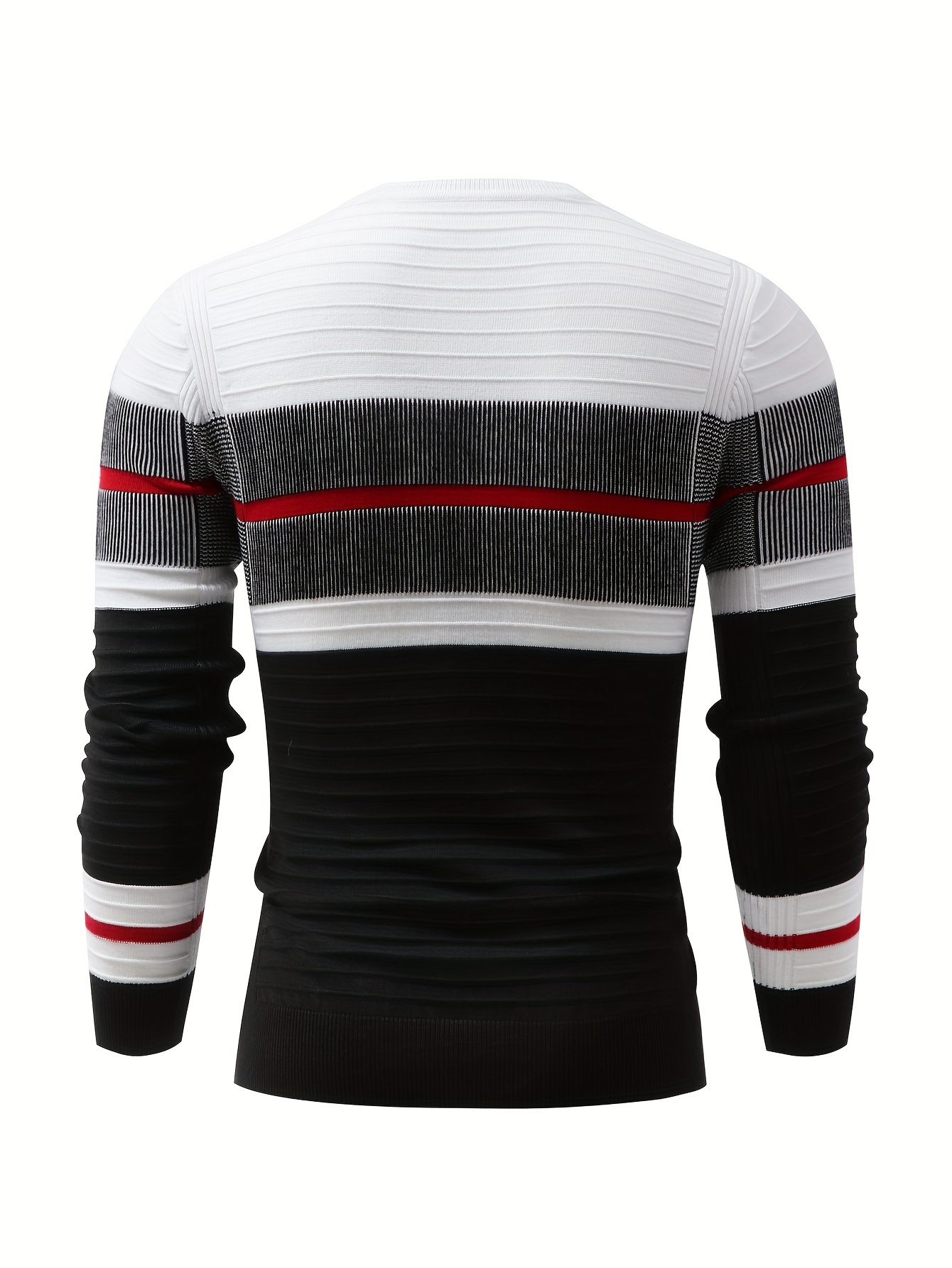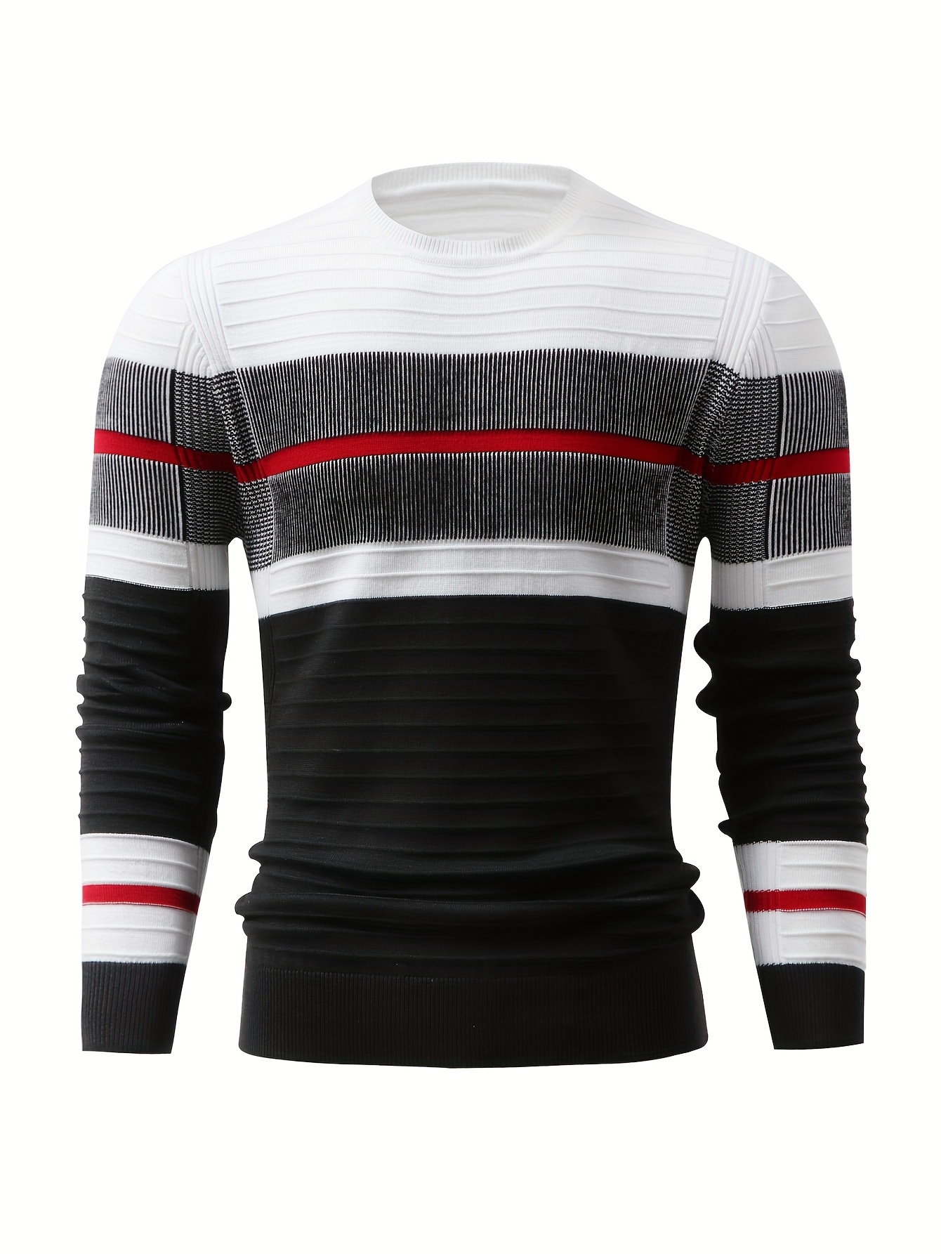 Men'S Fashionable Striped Knit Pullover Sweater - Stretchy Blend, Long Sleeve, Round Neck, Black/White/Red Vertical Stripes, Casual Style for Fall/Winte