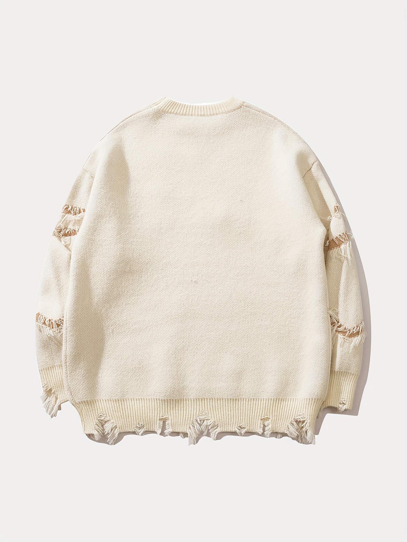 Unisex Street Style Knit Sweater, Fall/Winter Crew Neck Long Sleeve Pullover with Alphabet Print, Ripped Fringe Detail, Loose Fit, 42% Acrylic 28% Polyamide 30% Polyester Knit Fabric