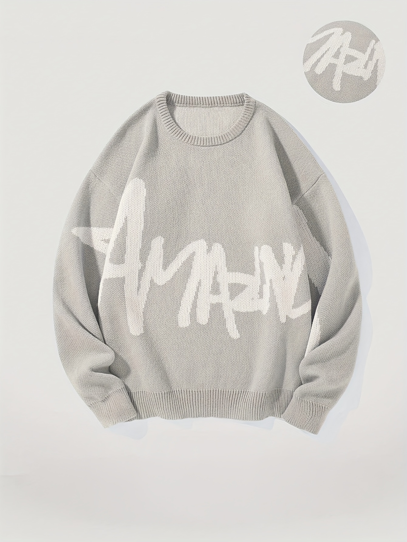 [Winter Streetwear Sweater] Autumn/Winter JNBLDA Men's Streetwear Casual Loose Fit Knit Sweater | Round Neck Long Sleeve Pullover with 'amani' Letter Print, Ribbed Cuffs & Hem