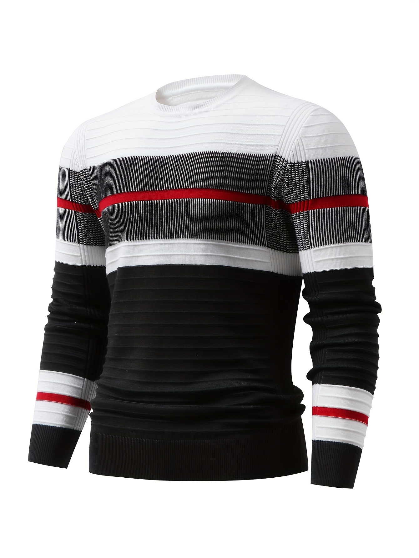Men'S Fashionable Striped Knit Pullover Sweater - Stretchy Blend, Long Sleeve, Round Neck, Black/White/Red Vertical Stripes, Casual Style for Fall/Winte