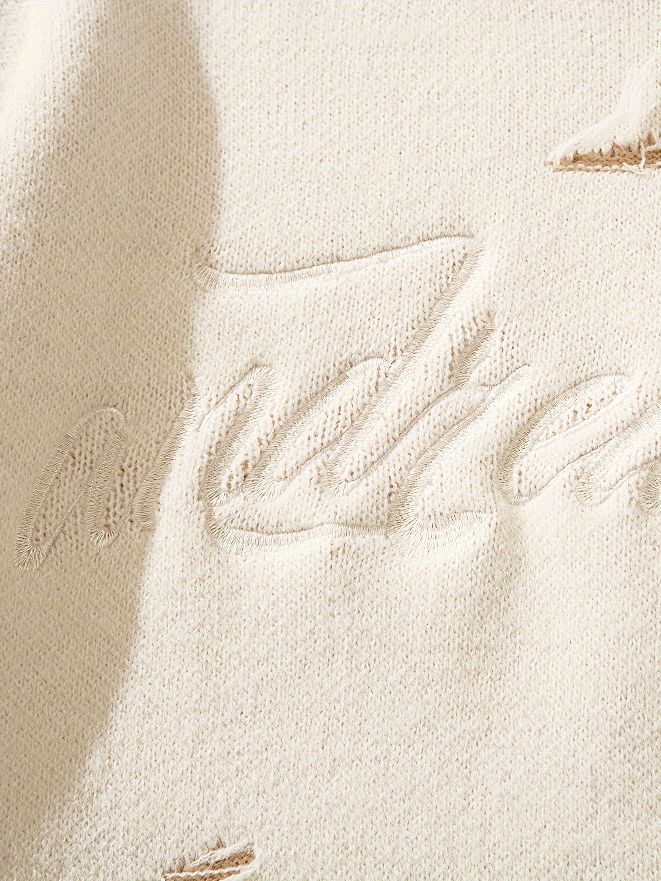 Unisex Street Style Knit Sweater, Fall/Winter Crew Neck Long Sleeve Pullover with Alphabet Print, Ripped Fringe Detail, Loose Fit, 42% Acrylic 28% Polyamide 30% Polyester Knit Fabric